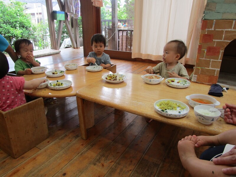 0歳児 1・2歳児 3・4・5歳児 《0歳児》 8:00~ 朝の受け入れ・あそび 9:00 ふれあいあそび・マッサージ・午前寝 10:00 離乳食 13:00 睡眠 14:15~ 午後食・あそび・睡眠 17:30 降園 保育終了・閉園 《1・2歳児》 7:30~ 朝の受け入れ 8:30 自由あそび(庭・室内リズム) 9:30 クラス毎の活動・園庭あそび・散歩 10:30 1歳児食事 10:45 2歳児食事 12:30 午睡 14:30 着替え・おやつの準備 15:00 おやつ・あそび 17:30 降園 保育終了・閉園 《3・4・5歳児》 7:30~ 朝の受け入れ 8:30 自由あそび 9:30 クラス毎の活動 11:10 食事準備 11:30 昼食 12:30 絵本 13:00 午睡 14:30 着替え・おやつの準備 15:00 おやつ・あそび 17:30 降園 保育終了・閉園